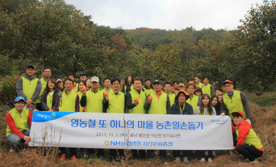 [보험매일=손성은 기자] 농협생명 김희석 자산운용총괄부사장과 직원 40여명은 지난 2일 ‘또 하나의 마을’ 결연을 맺은 충남 예산군 덕산면 상가리를 찾아 제철 맞은 감 수확을 도왔다.